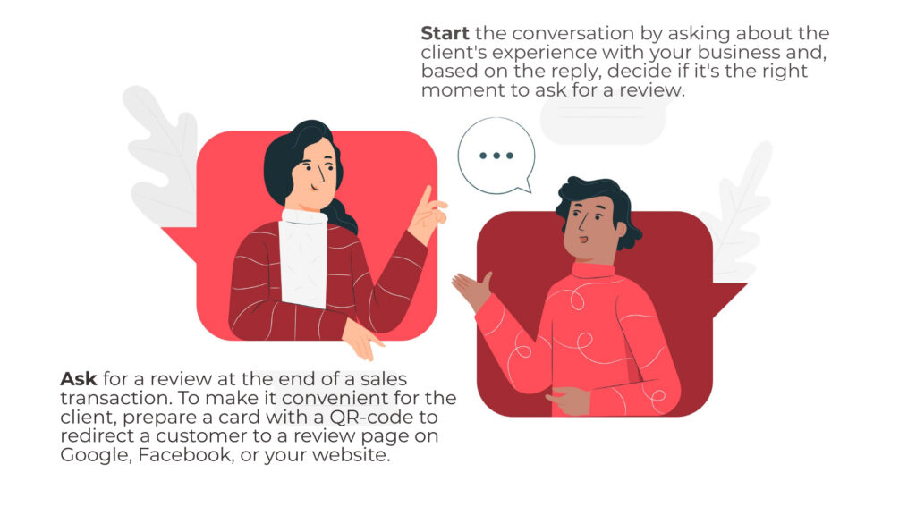 - Another way is to ask for a review at the end of a sales transaction. To make it convenient for the client, prepare a card with a QR-code to redirect a customer to a review page on Google, Facebook, or your website.