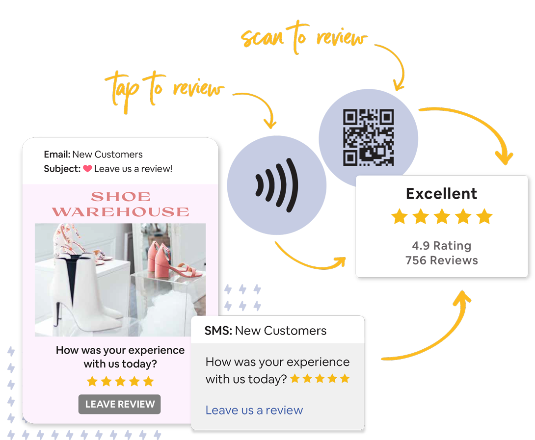 Your customers can easily tap their phone or scan a code to instantly review you in store or on the go.